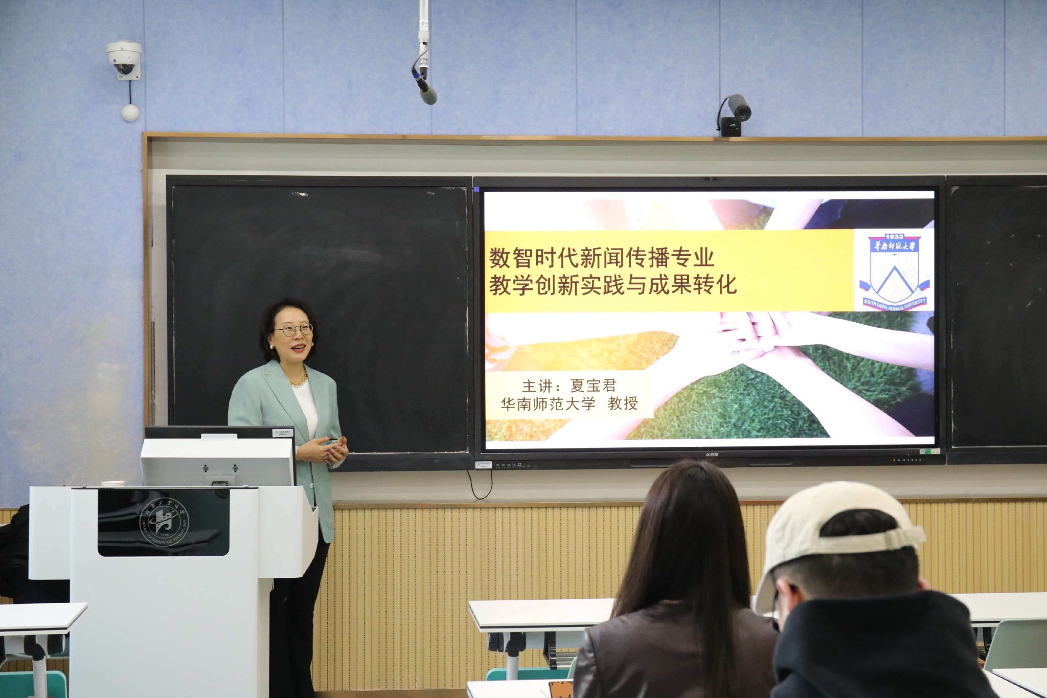 为应对数智时代对新闻传播人才培养提出的新挑战,深度探索教学创新与成果转化的有效路径,新闻与传播学院于10月21日在莲花街校区博识楼3205智慧教室举办高层次教学工作坊。本次工作坊特邀国家一流课程负责人、首届国家教创赛一等奖获得者华南师范大学夏宝君教授担任主讲嘉宾,围绕“数智时代新闻传播专业教学创新实践与成果转化”主题,开展了为期一天的深度研讨与教学交流。